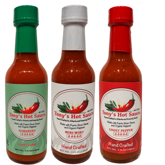 Salsa picante artesanal Tony's, paquete combinado de 3 botellas de 5 oz: "Habanero, Wiri Wiri y Ghost Pepper"